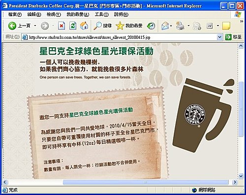 「愛上咖啡因」的版主又要來報好康的啦,只要在4/15這一天,拿著可重覆使用的杯子,到星巴克門市就可以享有精選咖啡一杯,想喝免費咖啡的人,就一同共襄盛舉吧!還有,杯子別忘了帶~ 詳情請見星巴克官網。
