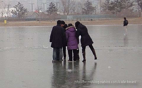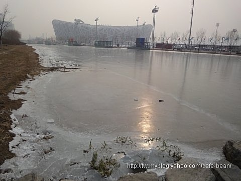 我去北京(12/25那幾天)時天氣剛好是入冬以來最冷的時候,沒有水氣,也沒有下雪,一整個乾冷到不行,看看戶外的溫度計,竟然寫著零下12度,也難怪經過北京鳥巢旁的運河時,看到一堆人在結冰的河上走來走去,玩得不亦樂乎。此時我的好奇心又驅使我下去走一走,就這樣,生平第一次走在結冰的河上,從河的這一頭走到另一頭,深怕一不小心冰破了,來不及跑就掉到河裡面去了,這才體會什麼是什麼「如履薄冰」的感覺是什麼樣子的,實在有夠恐佈的。