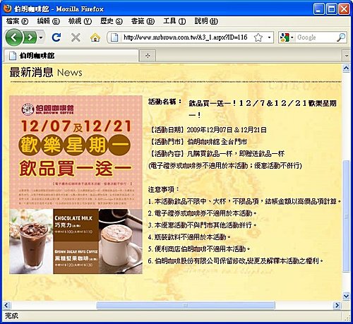 2009年年底真是喝咖啡的好日子,不僅是天氣冷喝咖啡好舒服,咖啡店之間的競爭也非常火熱,繼星巴克的感恩回饋日推出後,伯朗咖啡館也在 12/7 與 12/21 這兩天推出飲品買一送一的特惠活動,身為「愛上咖啡因版主」當然要把這個好消息告訴大家,在這兩天裡,不管是那一間門市都有優惠,想佔伯朗咖啡便宜的人,動作要快喔!!