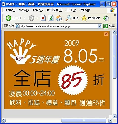 動作要快喔!只有1天,2009年8月5月星期三,85度c歡慶週年慶,想喝便宜咖啡、便宜蛋糕與麵包的人,趁今天要動作快一點喔!!