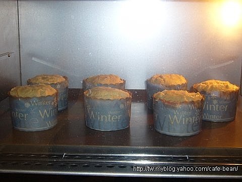裝好麵糊的紙杯平均位置地放入烤箱裡等待烘烤,要隨時注意不要烤焦了。此時烤箱溫度設定上火與下火都調成170度來烤 30分鐘。烤到後來若不知有沒有烤熟,拿根竹籤插一下,若沒有溼溼的麵糊黏在上面就表示有烤熟,反之再繼續烤下去。