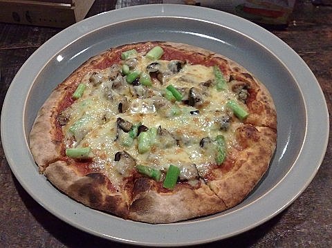 說了這麼多,不如先吃吧!這回點了字宙無敵好吃的(真不知誰想出來的?)「鮮菇蘆筍」與「煙薰乳酪」pizza,只見到店員現場桿平、鋪料,進窯子烤,不一會兒(不到5分鐘)就烤好了,再用刀子切成6等份後就可以端上桌享用了。由此可知窯子裡的溫度非常高,一片薄皮pizza不消3分鐘就可以烤熟,那麼有機會烤烤竹山地瓜也應該也會很快熟吧?