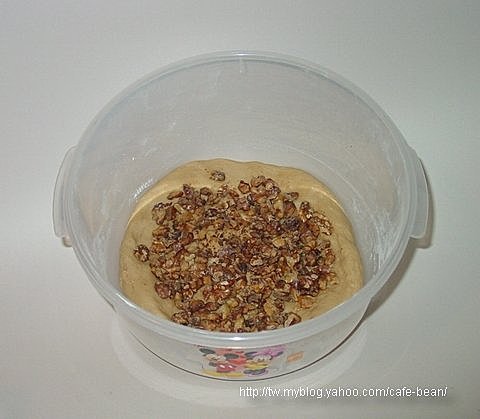 將烤好的核桃豪邁地揉進咖啡麵包的麵團裡