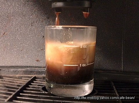 既然叫「核桃拿鐵咖啡麵包」,想當然爾,主角除了核桃與不加一滴水的濃濃鮮奶外,就屬咖啡最重要了,所以麵包的原料要嚴選,要用就用最好的,於是就拿剛烘好,養豆養了5天的最新鮮咖啡-葉門摩卡瑪妲莉來製作香醇的義式咖啡(espresso)。如下圖所示,內行的都知道,2 oz(盎司) espresso裡面有1 oz的 crema是有多麼的迷人,就這樣,將最好喝的espresso連同厚厚的crema通通倒進揉得差不多快好的麵團裡,進而讓揉好的麵團能呈現誘人的咖啡色色澤。