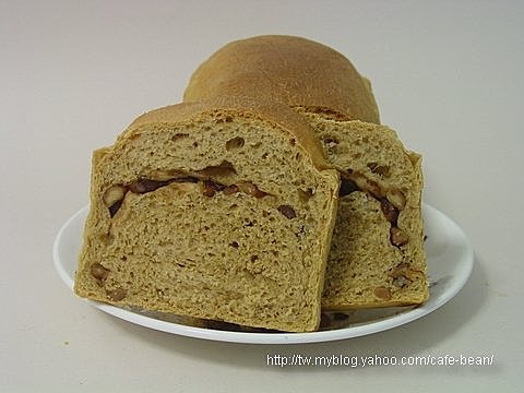 烤箱要先預熱,以上火200度,下火180度,烤上25分鐘後,就有香噴噴的烤土司麵包可以吃了。如下圖,就是剛烤好的核桃咖啡麵包。若不怕胖的話,可以在土司表面上刷上一層薄薄的奶油,會變得更香更好吃喔~