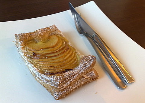 喝完了咖啡後,又再往回走,回到原先要吃的下午茶蛋糕店,這回沒點半熟巧克力,改點現烤蘋果派,所以從擺盤與用具猜出是那家店了嗎?答案在這裡.