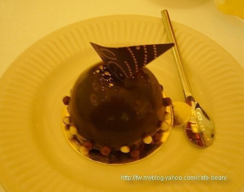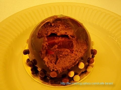 話不多說,沒吃到甜點就不算來到「品悅糖」,先品嚐的是巧克力布朗尼,圓滾滾的半球型巧克力外型非常討喜,裡面搭配的是酸酸的覆盆子果泥(依口感猜測)與巧克力慕斯蛋糕體,吃起來帶酸味的口感和想像中的苦甜口感的布朗尼有著很大的差異.