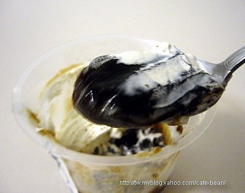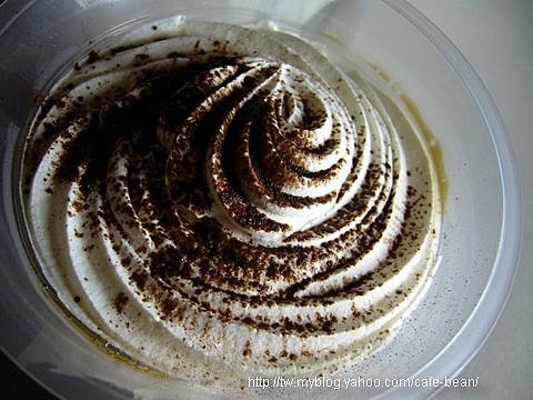 這是鮮奶油佐可可咖啡凍,表面上一圈圈的鮮奶油讓人光用看就口水流不停了