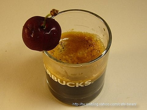 3. 在加好 espresso 的杯緣上再放上一顆的新鮮黑櫻桃做裝飾,就完成了.