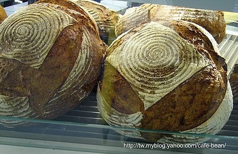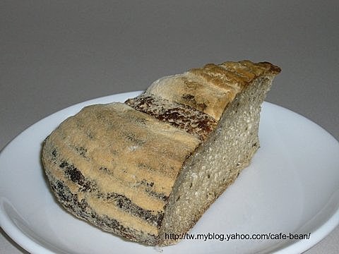 這次買的是法國傳統的天然酵母麵包(鄉村麵包),光是低溫醱酵就要花上一天的時間,由於在醱酵時需要使用到藤模,所以麵包的體積相當大,就像是一個大碗公那麼大。若是單買一個要花費900元,而我只是想嚐嚐味道,就買了一個切片的,這個切片也不算小,大約有1/5個麵包那麼大,要價175元,結帳時差點沒暈倒,還一直問店員有沒有算錯,因為比較小的另外一切片看起來差不多大,價錢卻只要90元,和175元相比貴很多耶。回家後切開來吃吃看,真的有出現天然酵母所散發出來的麥香與微酸口感,那股悸動,會讓人因吃到好東西而滴出幾滴眼淚來。畢竟在台北,除非是自己做,若要吃到真正Sourdough(老麵)做出來的酸味麵包實在很難甚至是吃不到,即使是日式風格的山崎(Yamasaki)出的天然酵母麵包,吃起來還是少了股麥香也少了法式酵母麵包的酸勁,所以我覺得這麵包雖然貴但還蠻值得的,至少可以不用辛苦一整天只為了做一個麵包,還可以輕輕鬆鬆地喝著咖啡,再嚼著濃濃麥香又不用擔心會讓肚子脹氣的天然酵母麵包。