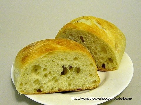除了傳統的天然酵母麵包外,也買了Ciabatta(拖鞋麵包)來吃吃看,Ciabatta很重視的是麵包內的氣孔組織,若氣孔組織不夠大不夠均勻就不能算是及格的麵包,在切開後,氣孔組織的表現還不錯,雖不能得到滿分,也有個90分了呢!! 把麵包再橫切包上起司、火腿與蔬菜後,就是好吃的下午茶點心,再配杯手沖咖啡或義式拿鐵,和著咖啡一起吃,很辛福也很開心。